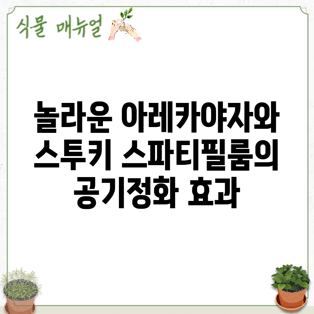 실내 공기를 정화하고자 하는 많은 사람들에게 아레카야자, 스투키, 스파티필룸은 특별한 선택이 될 수 있습니다. 각각의 식물은 고유한 장점과 단점을 가지고 있어, 개인의 환경이나 선호에 따라 선택할 수 있습니다.
